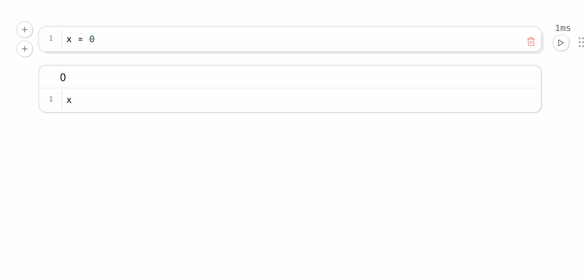 marimo’s reactive execution is based only on the global variables a cell reads and the global variables it defines. In particular, marimo does not track mutations to objects, i.e., mutations don’t trigger reactive re-runs of other cells. It also does not track the definition or mutation of object attributes. For this reason, avoid defining a variable in one cell and mutating it in another.