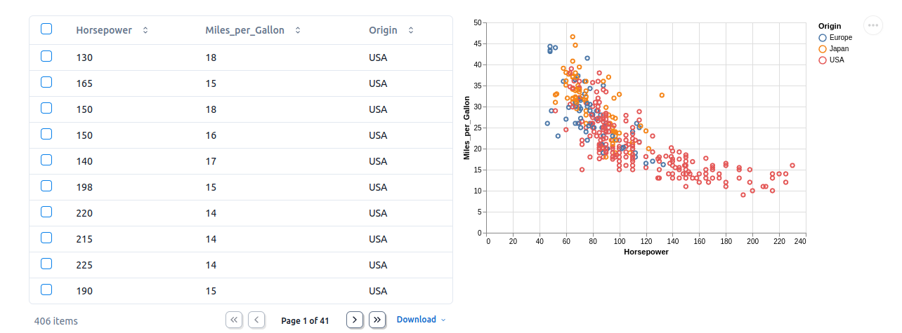 Select data in a table or Plotly/Altair plot, and your selection is automatically sent to Python as a Pandas dataframe.